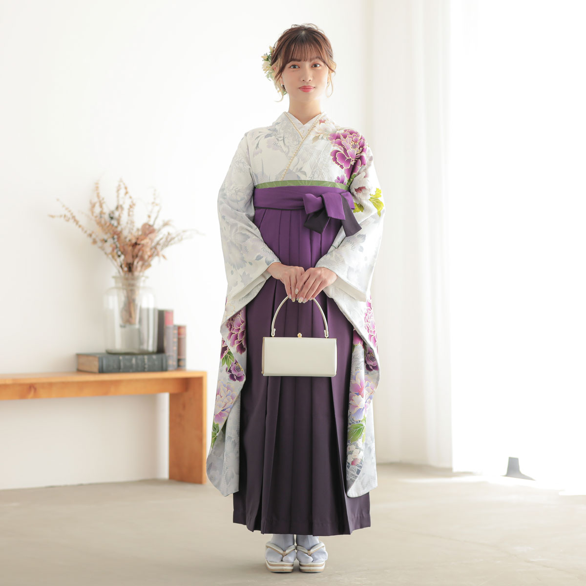 オフホワイト 檜扇に牡丹 レンタル 振袖袴 R2211