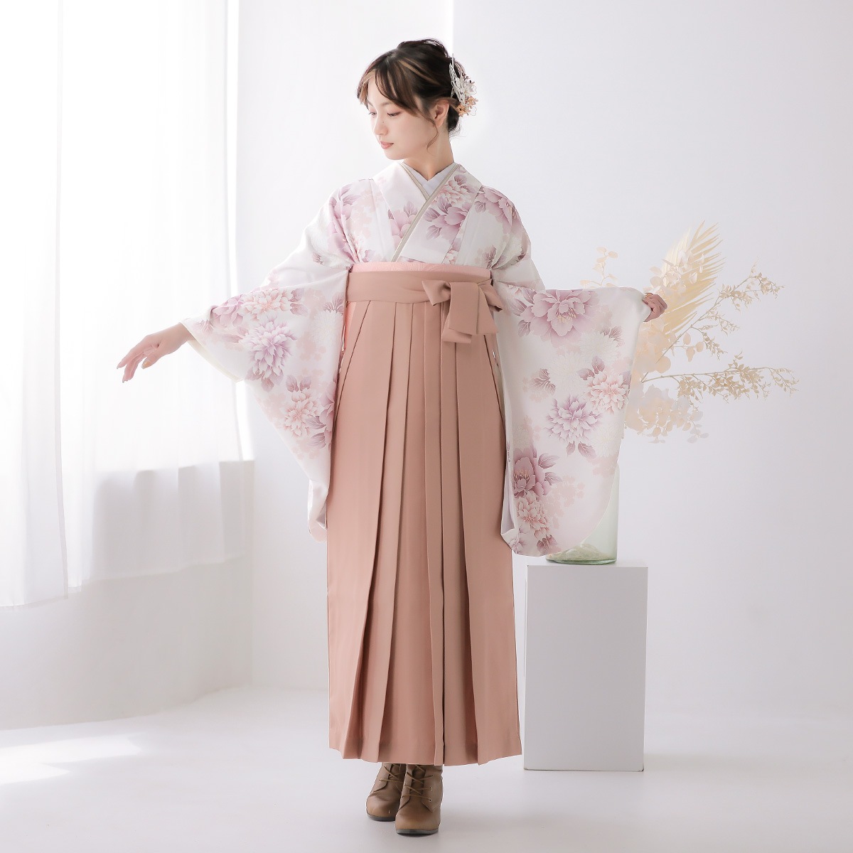 光沢感のある紗綾形の白地に、ベージュピンクやくすみ藤などの、淡く落ち着いたカラーの牡丹を散らした袴セット。やわらかな柄行が特徴です。小物類やブーツも白やモカなどのトーンの明るい色合いで合わせるのがおすすめです。