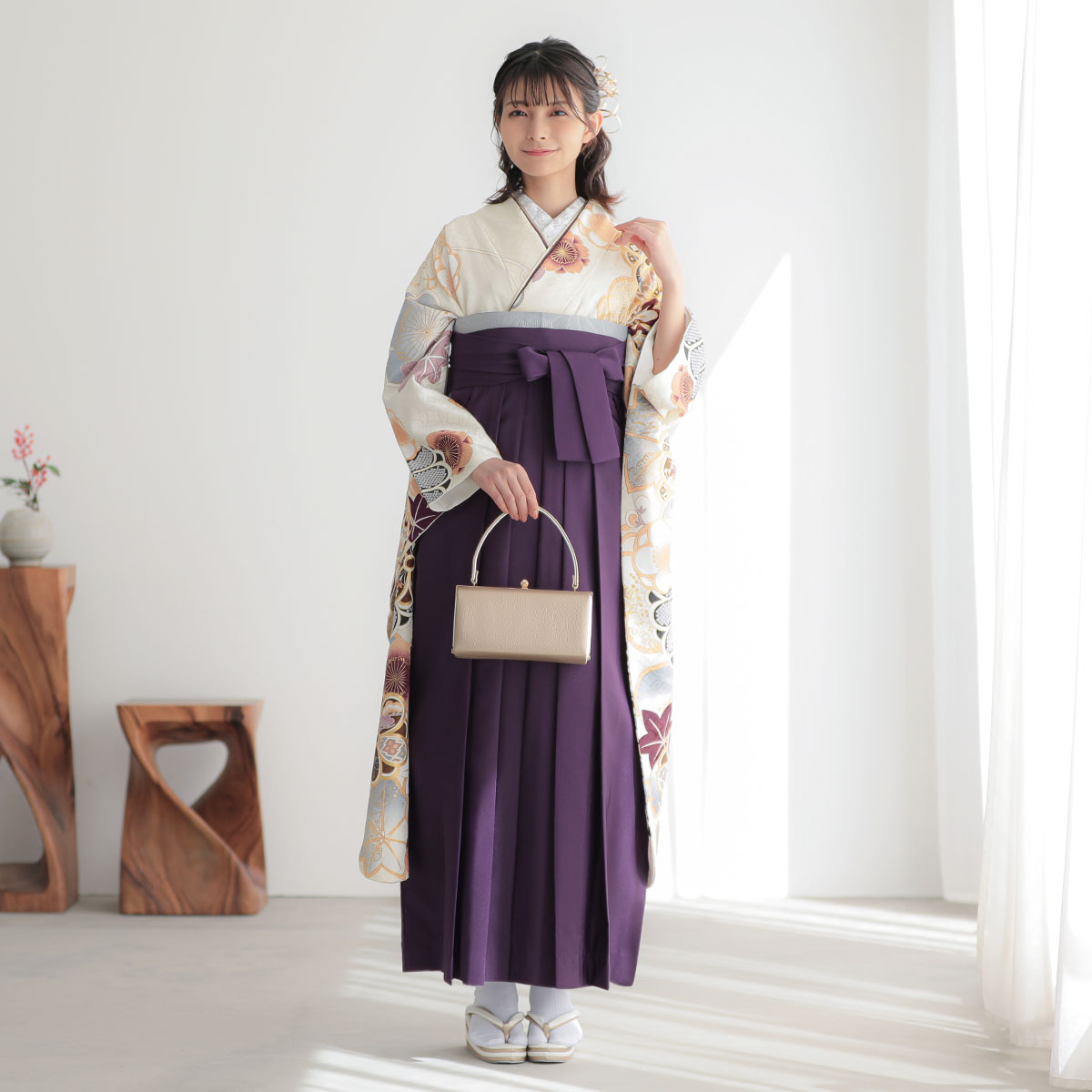 オフホワイト 梅に楓と手毬 レンタル 振袖袴 R2127