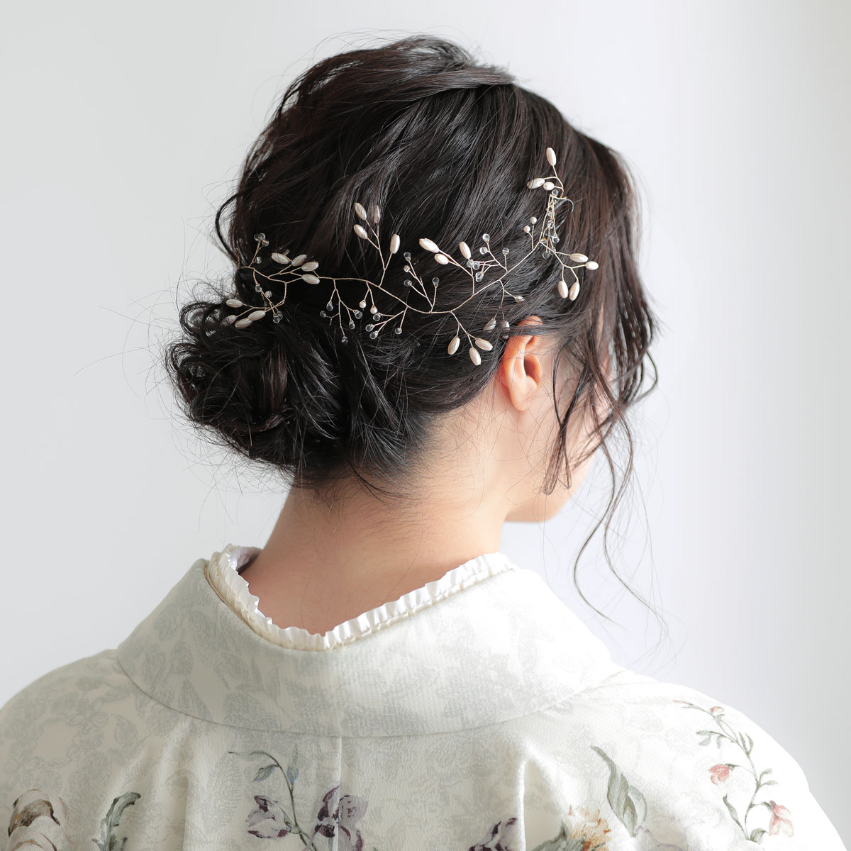 利休鼠を基調としたシックな色合いに、星屑を散りばめた幻想的なデザインが特徴の袴セット。地模様には七宝とストライプ模様が施され、伝統的な美しさとモダンさが融合しています。やわらかなカラーと星屑のデザインも相まって、かわいらしさのある柄行となっています。また、オリジナルデザインのため、他店ではレンタルできない特別な一着となっています。