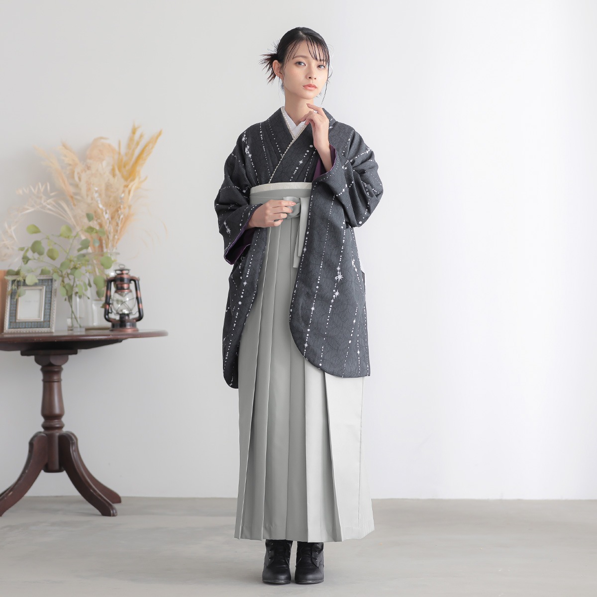 墨黒を基調としたシックな色合いに、星屑を散りばめた幻想的なデザインが特徴の袴セット。地模様には七宝とストライプ模様が施され、伝統的な美しさとモダンさが融合しています。墨黒のベースカラーが全体を引き締めていますが、星屑のデザインも相まって、かわいらしさもある柄行となっています。また、オリジナルデザインのため、他店ではレンタルできない特別な一着となっています。