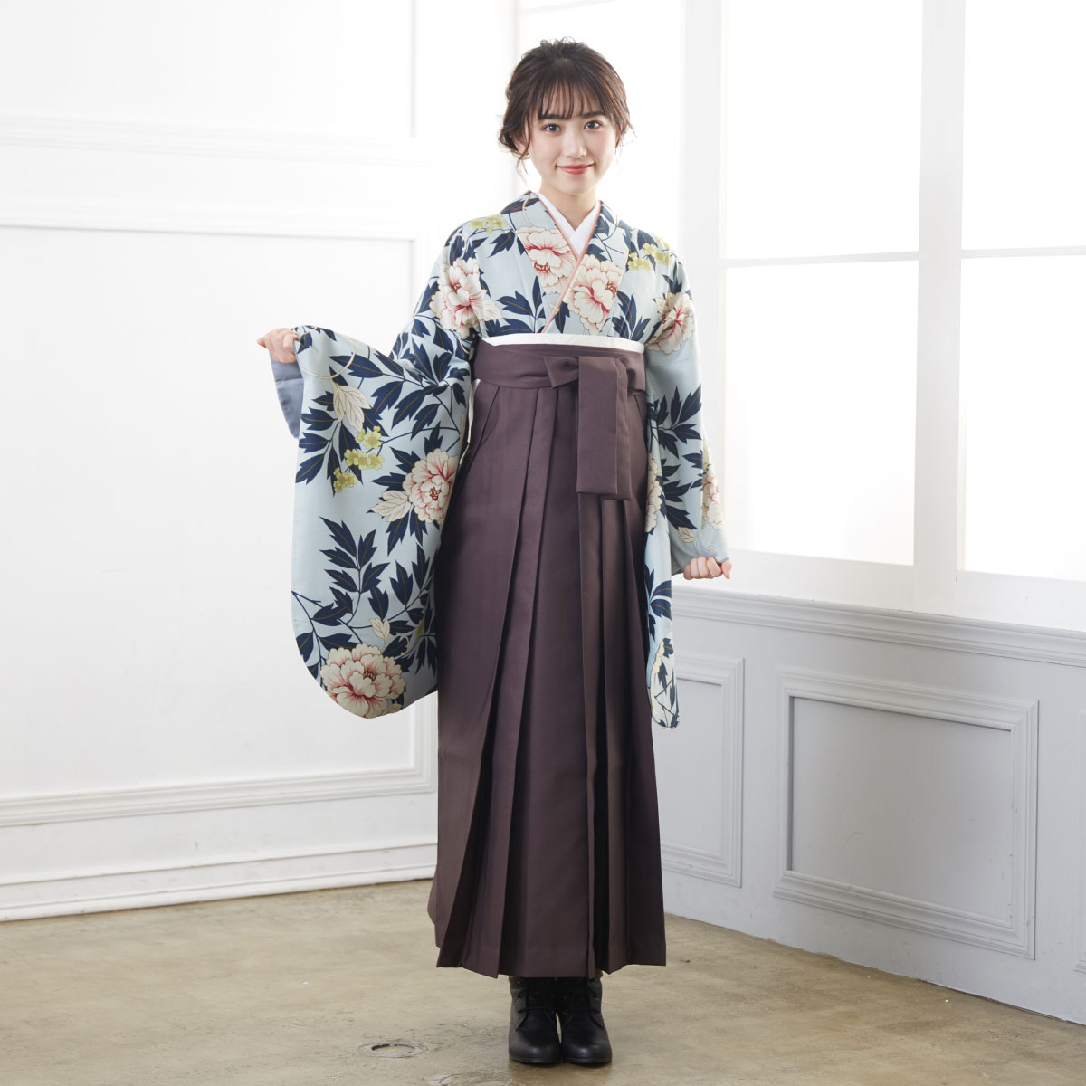 水色x白 牡丹に花々 レンタル 大学生袴 G1062