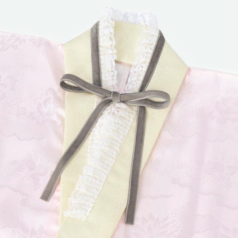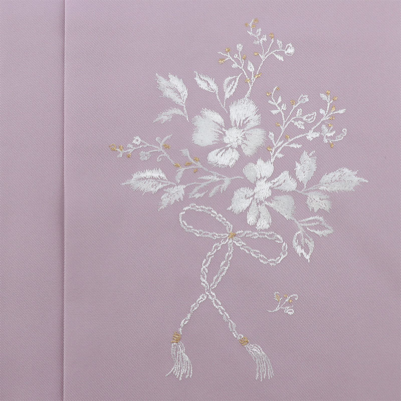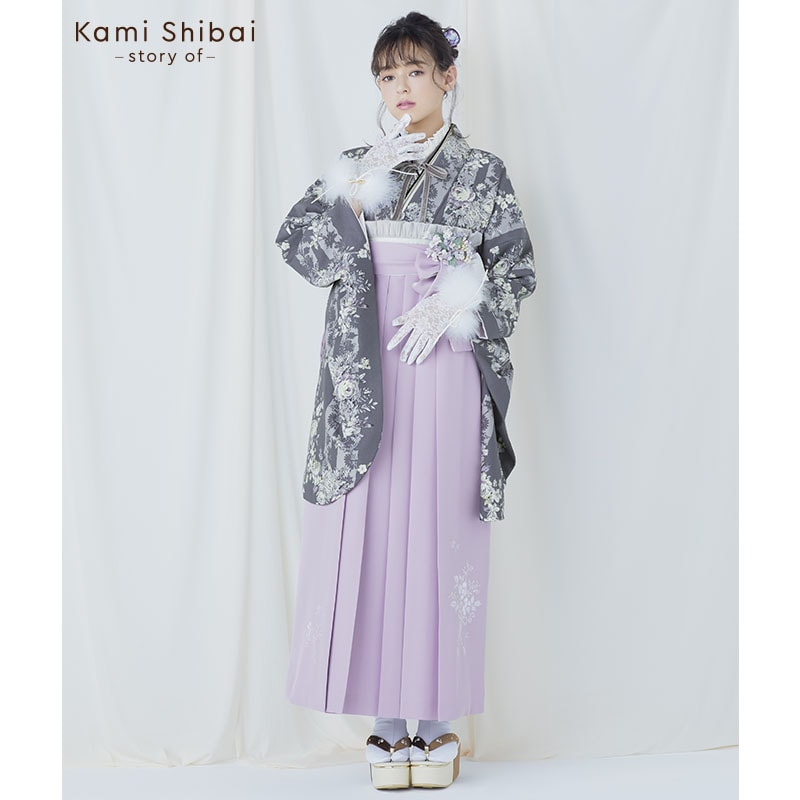人気ブランドブランド「Kami Shibai」の袴セット。ストライプに薔薇の花をモチーフにしたグレー地の着物に、草花の刺繍を施したラベンダー色の袴をコーディネート。オプション商品のグレーのベロアリボンがついた半衿をプラスして、ガーリーで大人可愛い雰囲気に。
