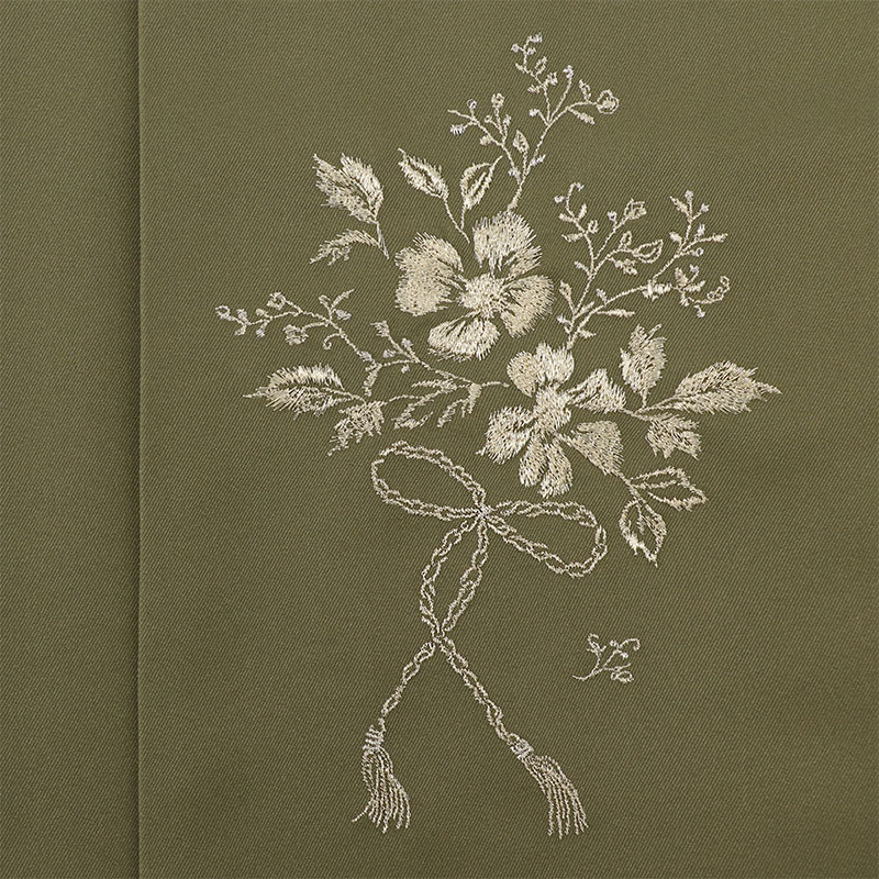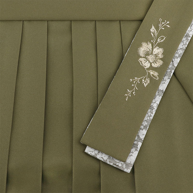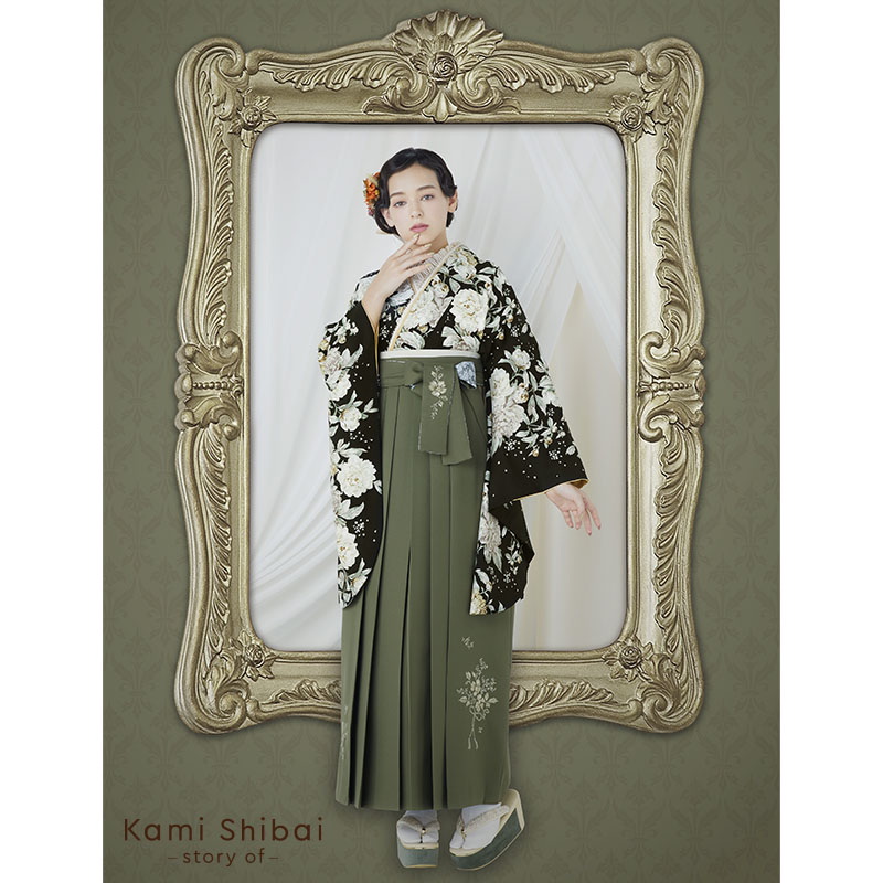 人気ブランドブランド「Kami Shibai」の袴セット。ロココ調の花をモチーフにした黒地の着物に、草花の刺繍を施したカーキの袴をコーディネート。シックなカラーが特徴の個性的で大人可愛い雰囲気のお着物です。