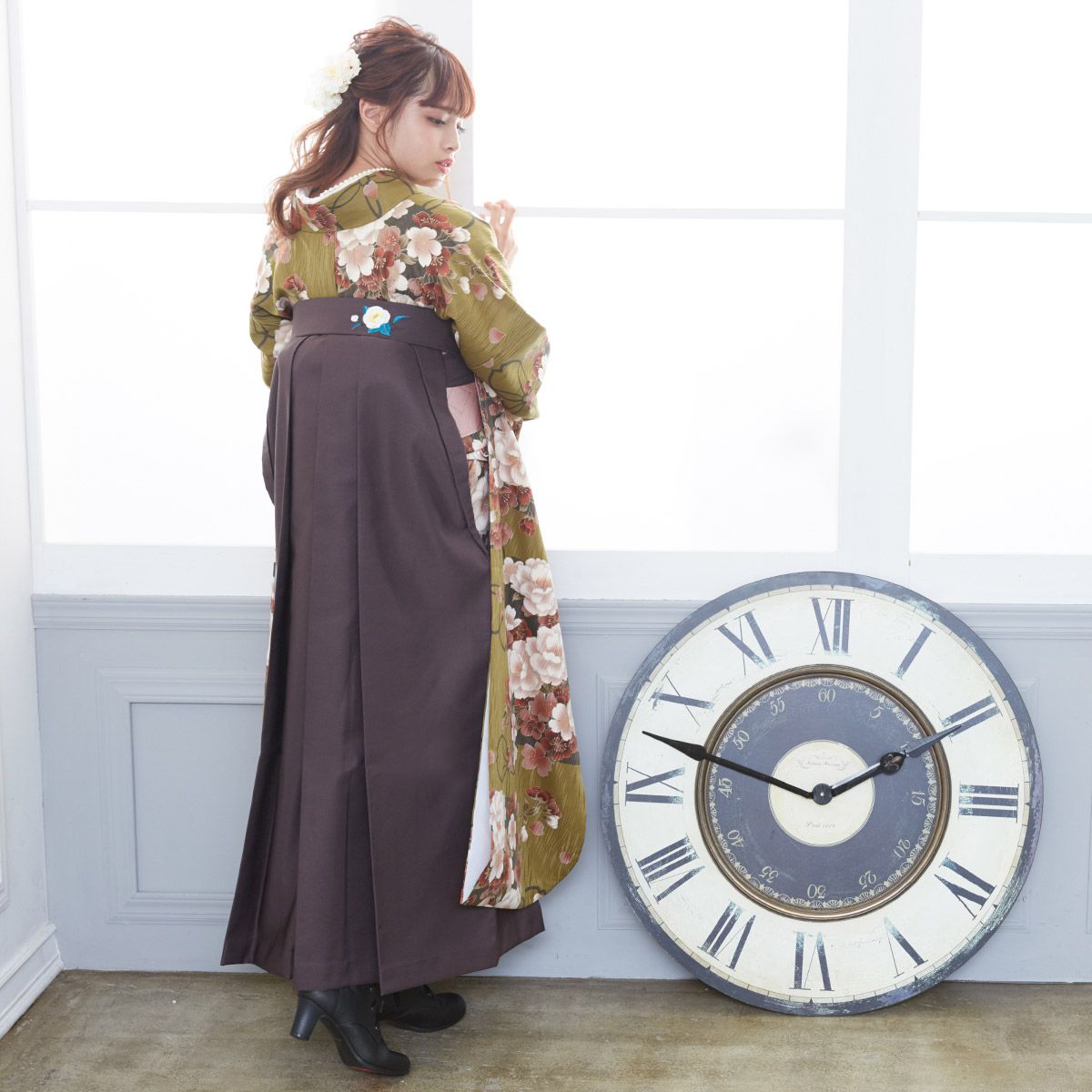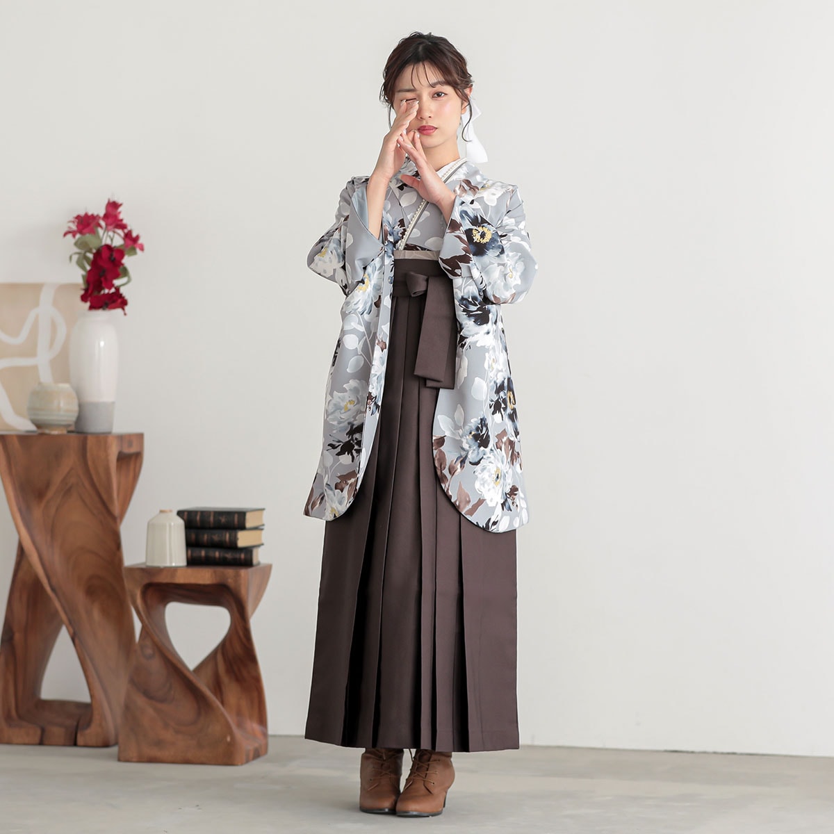 水彩画のような繊細で柔らかなタッチで描かれた花模様が印象的な一着。グレーを基調としたシックな色合いが大人っぽさと上品さを演出。華美になりすぎず、卒業式にふさわしいエレガントな雰囲気です。現代的ながらも組み合わせによってアンティークっぽくもなる、おすすめの袴セットです。